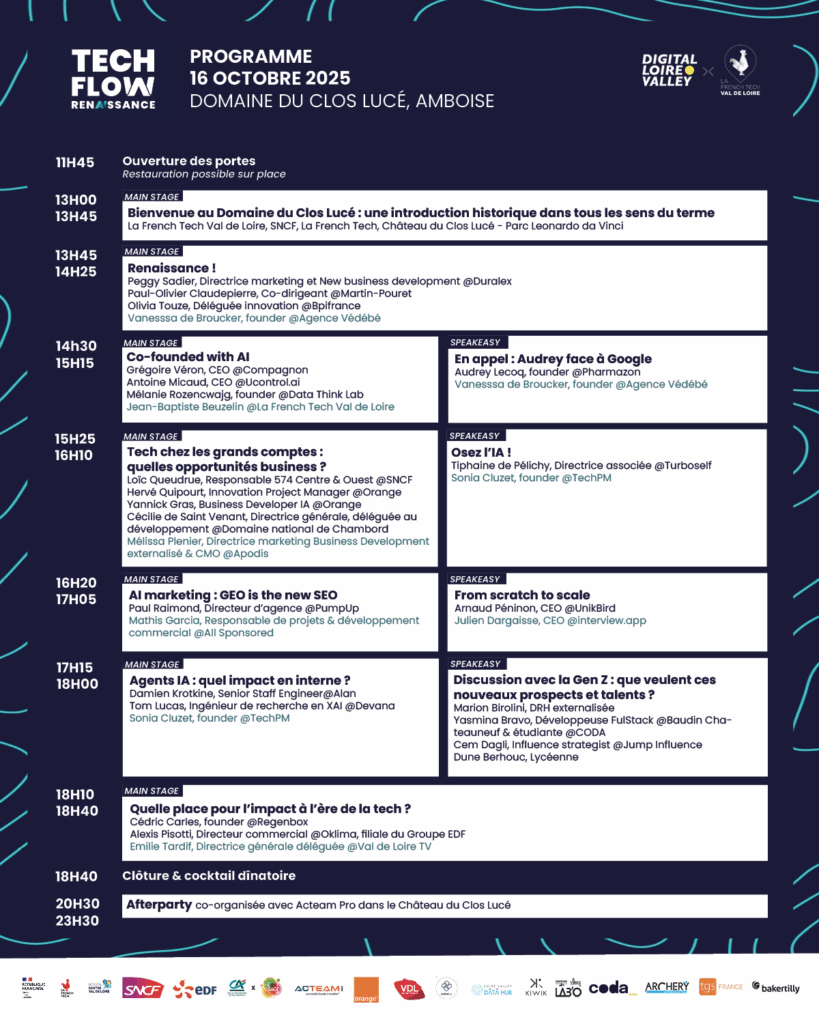 Cette année, Digital Loire Valley x La French Tech Val de Loire vous donne rendez-vous pour une nouvelle édition de Tech Flow, l’événement phare de la tech et de l’innovation en Centre-Val de Loire.